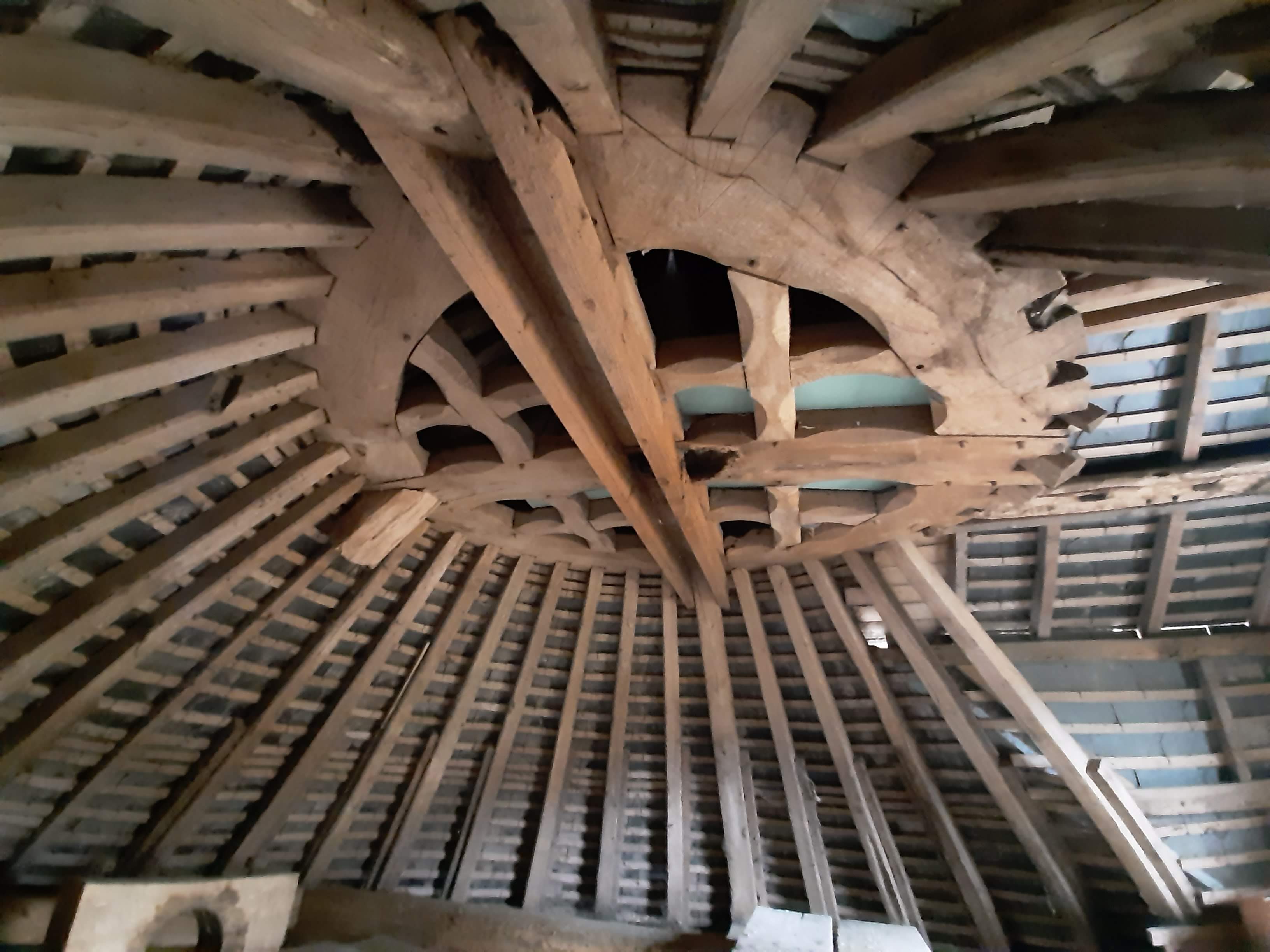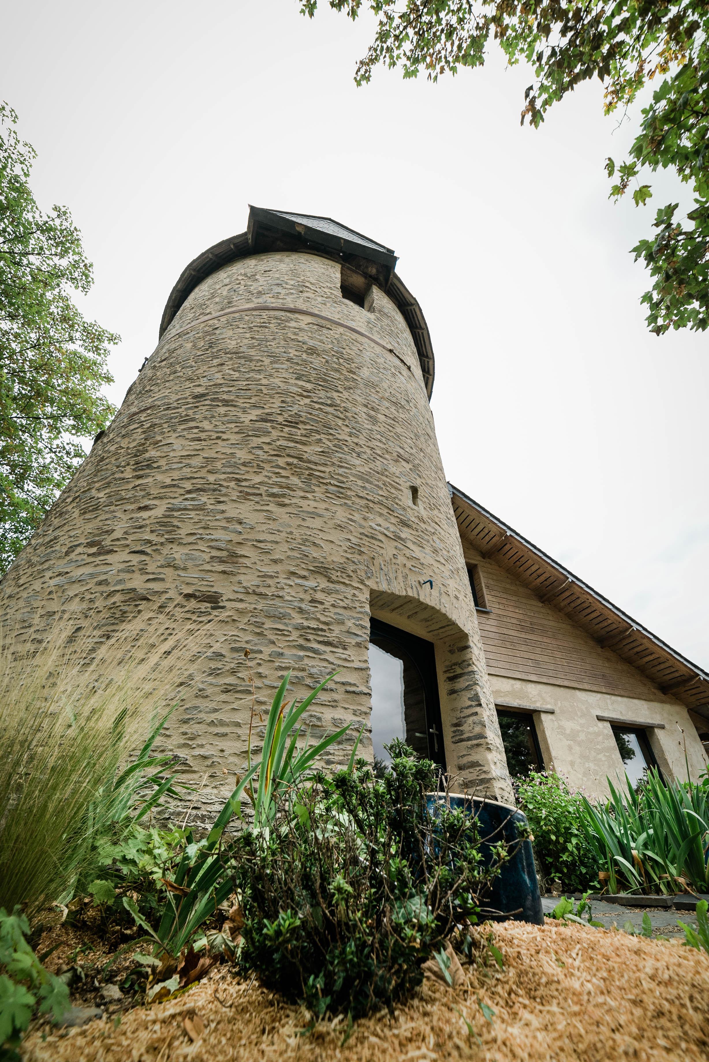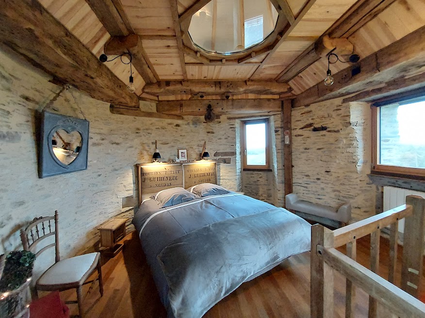Ancien moulin à vent daté de 1822 et restauré avec des matériaux écologiques . bois, pierres, chaux, chanvre, parquet de châtaignier, sol en terre cuite au rez-de-chaussée. Poutres apparentes, escalier de meunier d’origine en bois.